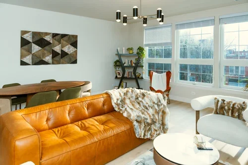 Brown leather couch with large scale art, bookcase and live plants